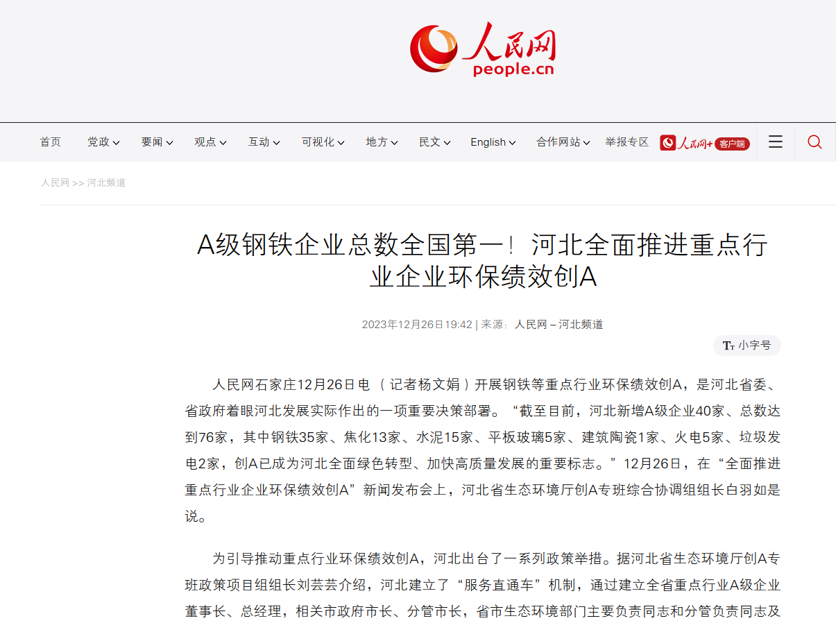 人民网:A级钢铁企业总数全国第一!河北全面推进重点行业企业环保绩效创A