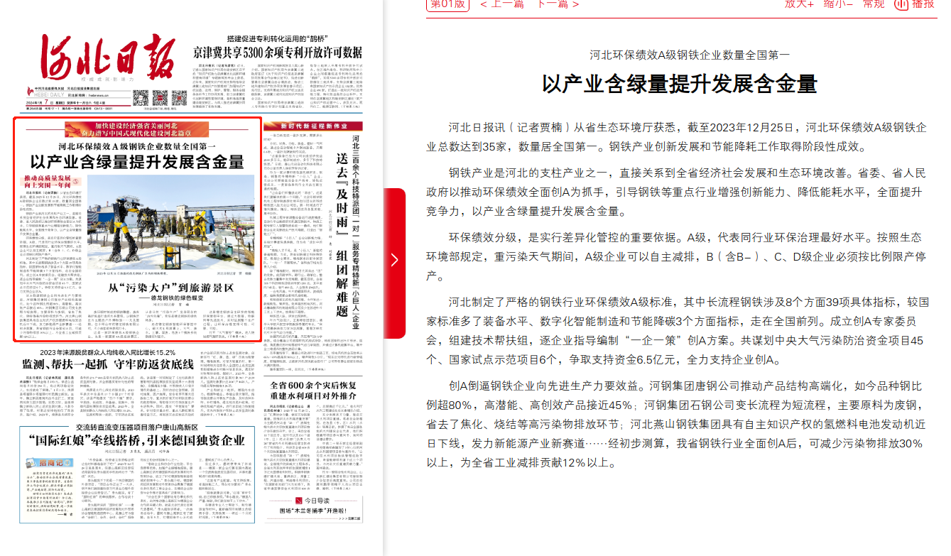 河北日报:河北环保绩效A级钢铁企业数量全国第一 以产业含绿量提升发展含金量
