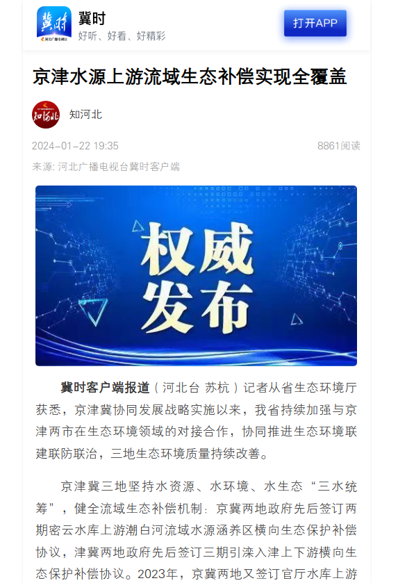 河北广播电视台冀时客户端:京津水源上游流域生态补偿实现全覆盖