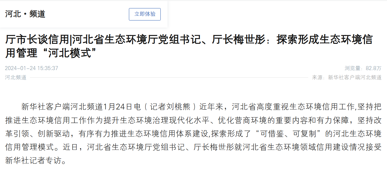 新华社客户端河北频道1月24日电(记者刘桃熊)近年来,河北省高度重视生态环境信用工作,坚持把推进生态环境信用工作作为提升生态环境治理现代化水平、优化营商环境的重要内容和有力保障,坚持改革引领、创新驱动,有序有力推进生态环境信用体系建设,探索形成了“可借鉴、可复制”的河北生态环境信用管理模式。近日,杏彩(中国)官方网站 党组书记、厅长梅世彤就河北省生态环境领域信用建设情况接受新华社记者专访。
