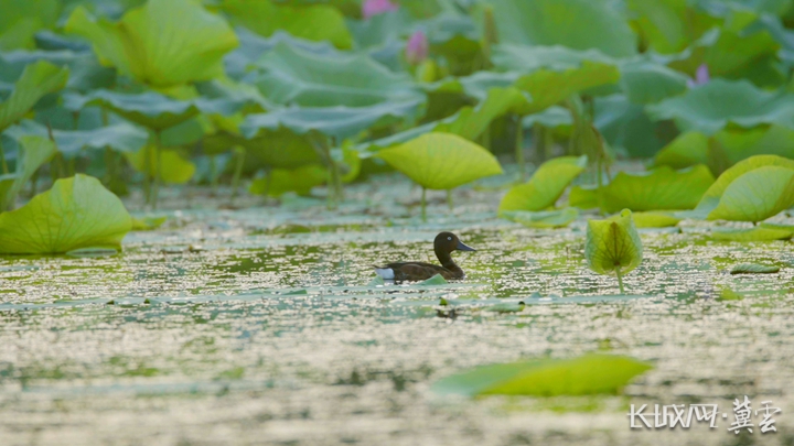 一只青头潜鸭在白洋淀荷塘边悠闲游弋。长城网·冀云客户端记者 邓光韬 摄