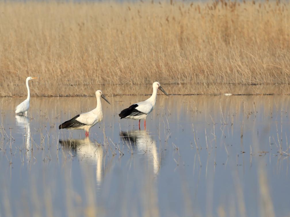 记者从位于河北省沧州市的南大港湿地和鸟类自然保护区管理处了解到,300多只国家一级保护动物东方白鹳近日飞抵南大港湿地,数量为去年同期观测记录的三倍。
