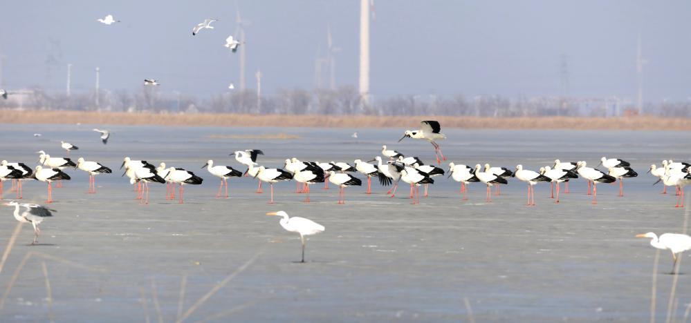 新华网:300多只东方白鹳现身河北南大港湿地