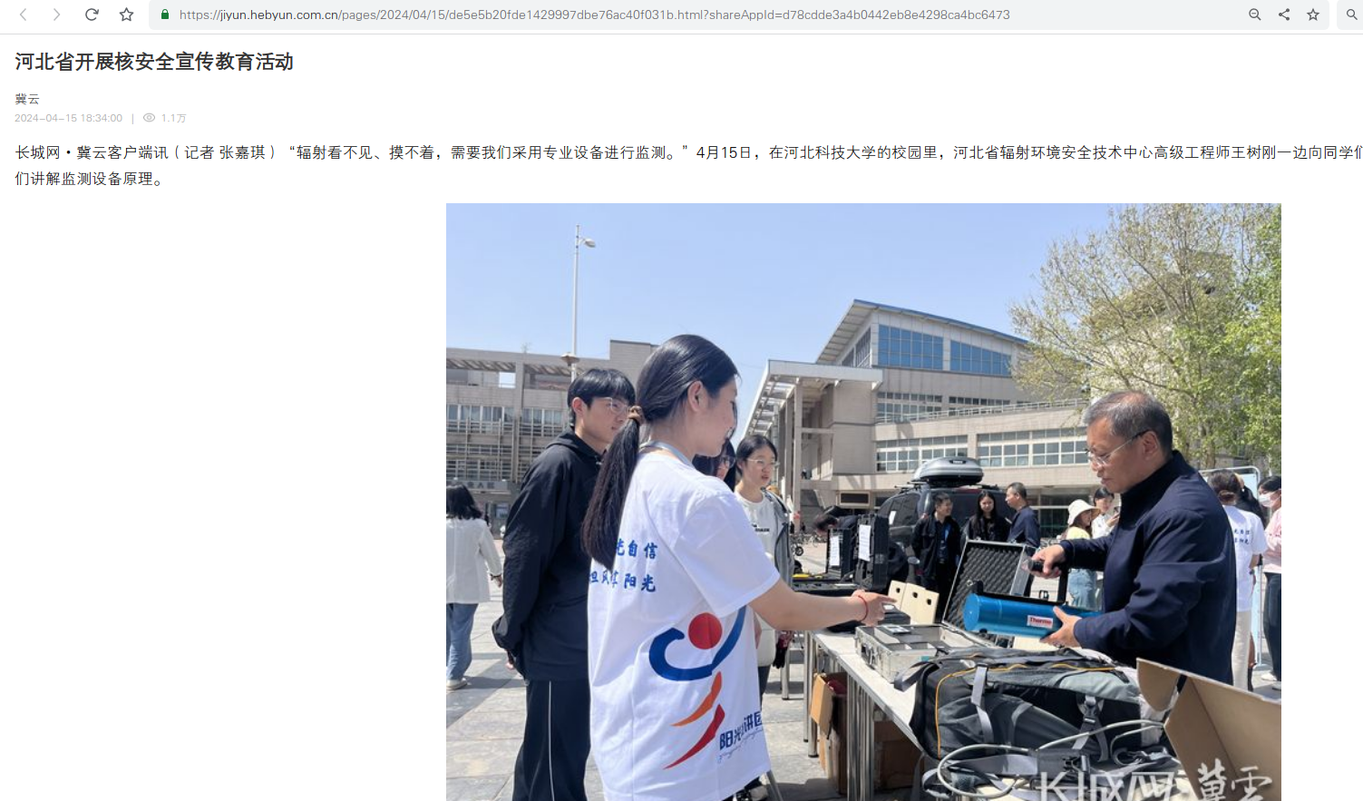 长城网·冀云客户端讯(记者 张嘉琪)“辐射看不见、摸不着,需要我们采用专业设备进行监测。”4月15日,在河北科技大学的校园里,河北省辐射环境安全技术中心高级工程师王树刚一边向同学们展示他们在工作中常用的辐射监测设备,一边向他们讲解监测设备原理。