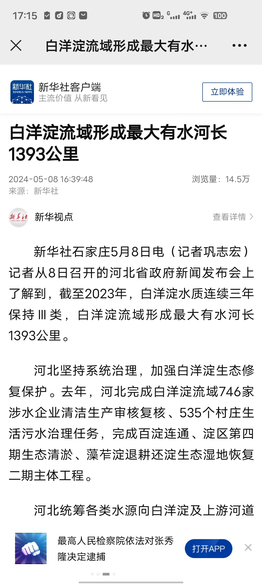 新华社:白洋淀流域形成最大有水河长1393公里