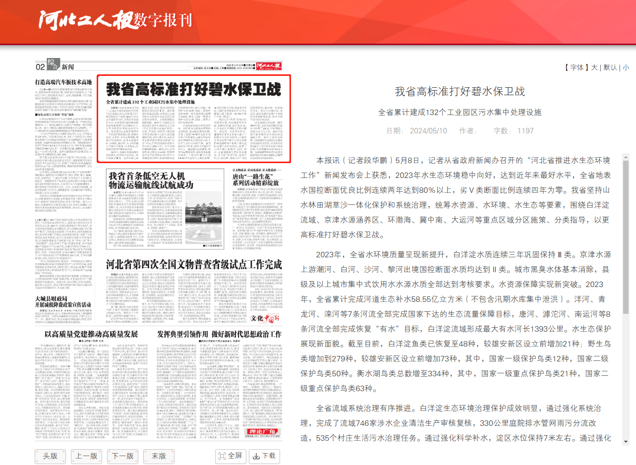 本报讯(记者段华鹏)5月8日,记者从省政府新闻办召开的“河北省推进水生态环境工作”新闻发布会上获悉,2023年水生态环境稳中向好,达到近年来最好水平,全省地表水国控断面优良比例连续两年达到80%以上,劣Ⅴ类断面比例连续四年为零。我省坚持山水林田湖草沙一体化保护和系统治理,统筹水资源、水环境、水生态等要素,围绕白洋淀流域、京津水源涵养区、环渤海、冀中南、大运河等重点区域分区施策、分类指导,以更高标准打好碧水保卫战。