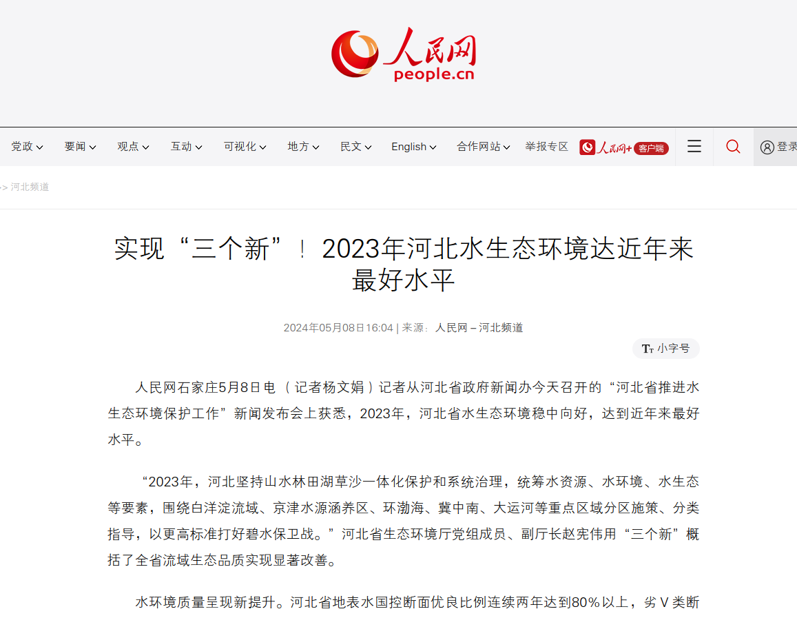 人民网:实现“三个新”!2023年河北水生态环境达近年来最好水平