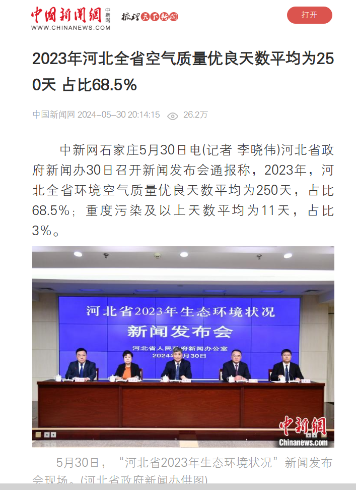 中国新闻网 :2023年河北全省空气质量优良天数平均为250天 占比68.5%
