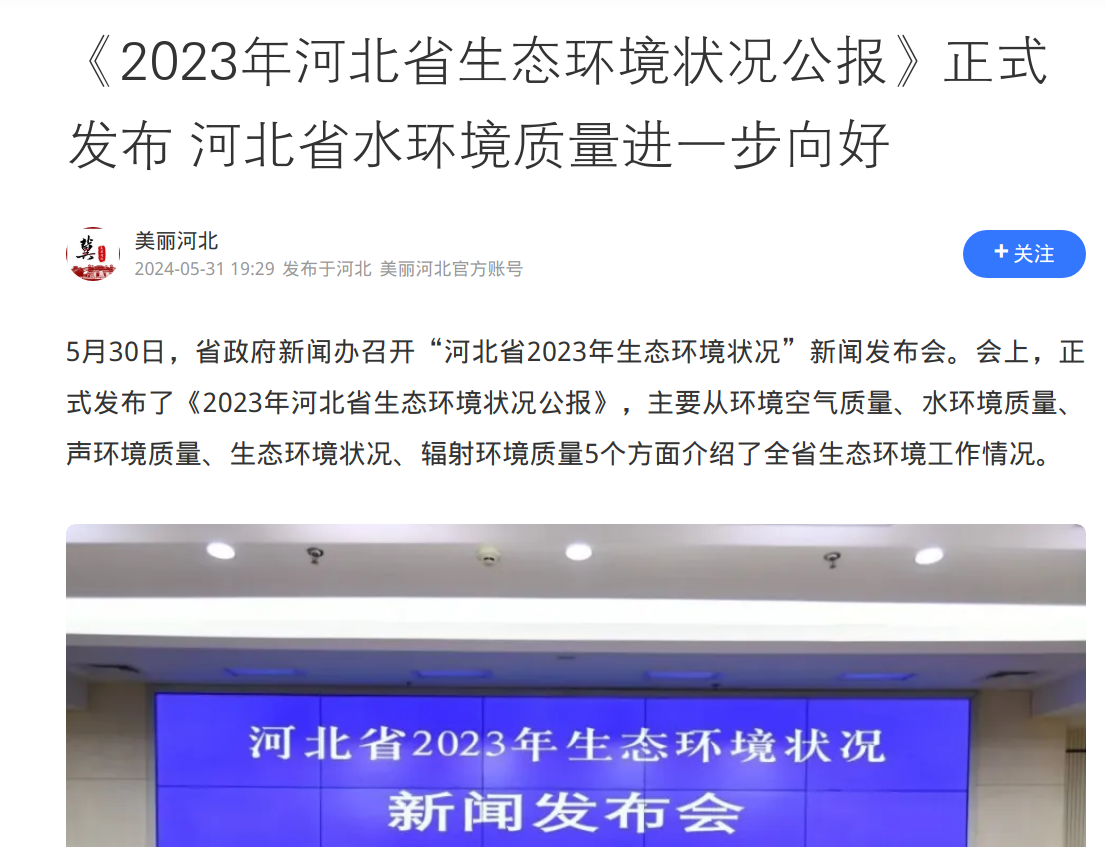 5月30日,省政府新闻办召开“河北省2023年生态环境状况”新闻发布会。会上,正式发布了《2023年河北省生态环境状况公报》,主要从环境空气质量、水环境质量、声环境质量、生态环境状况、辐射环境质量5个方面介绍了全省生态环境工作情况。