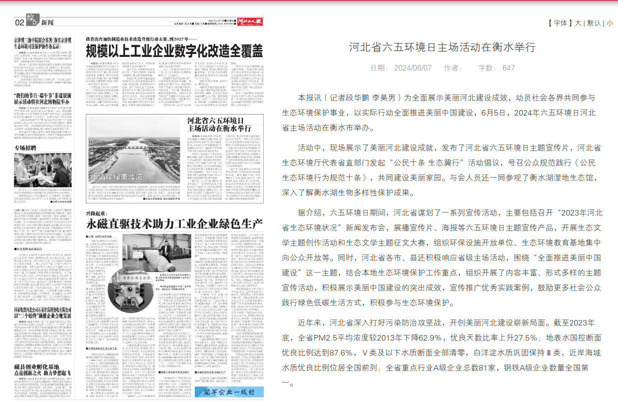 本报讯(记者段华鹏 李昊男)为全面展示美丽河北建设成效,动员社会各界共同参与生态环境保护事业,以实际行动全面推进美丽中国建设,6月5日,2024年六五环境日河北省主场活动在衡水市举办。