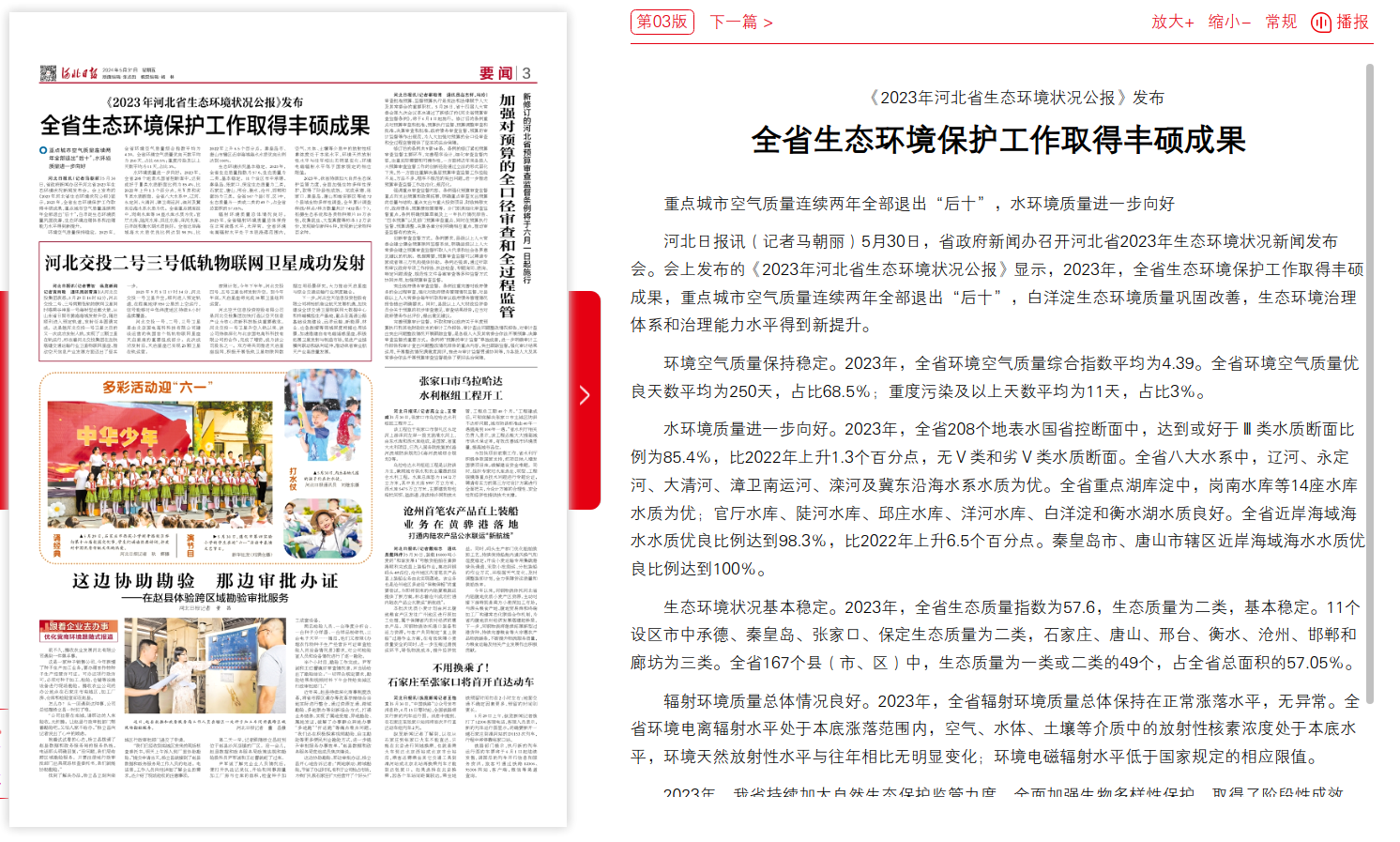 河北日报:《2023年河北省生态环境状况公报》发布   全省生态环境保护工作取得丰硕成果