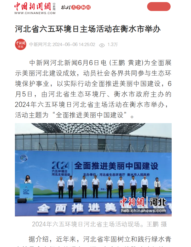 中新网河北新闻6月6日电 (王鹏 黄建)为全面展示美丽河北建设成效,动员社会各界共同参与生态环境保护事业,以实际行动全面推进美丽中国建设,6月5日,由杏彩(中国)官方网站 、衡水市政府主办的2024年六五环境日河北省主场活动在衡水市举办,活动主题为“全面推进美丽中国建设”。