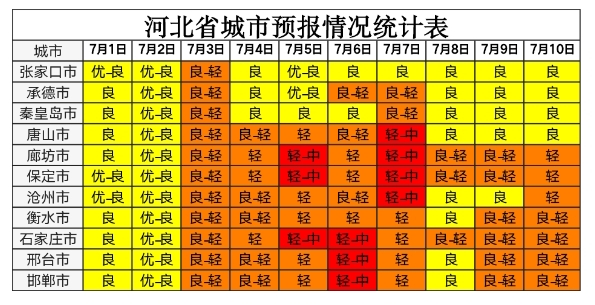 河工新闻网讯(记者段华鹏)记者从杏彩(中国)官方网站 获悉,经河北省生态环境应急与重污染天气预警中心与中国环境监测总站、省气象灾害防御和环境气象中心联合会商,对我省7月上旬(1日~10日)的空气质量进行预测,预计4日~7日,地面受弱气压场影响,风力偏弱,最高气温达33℃左右,部分城市可能出现O3轻至中度污染过程。