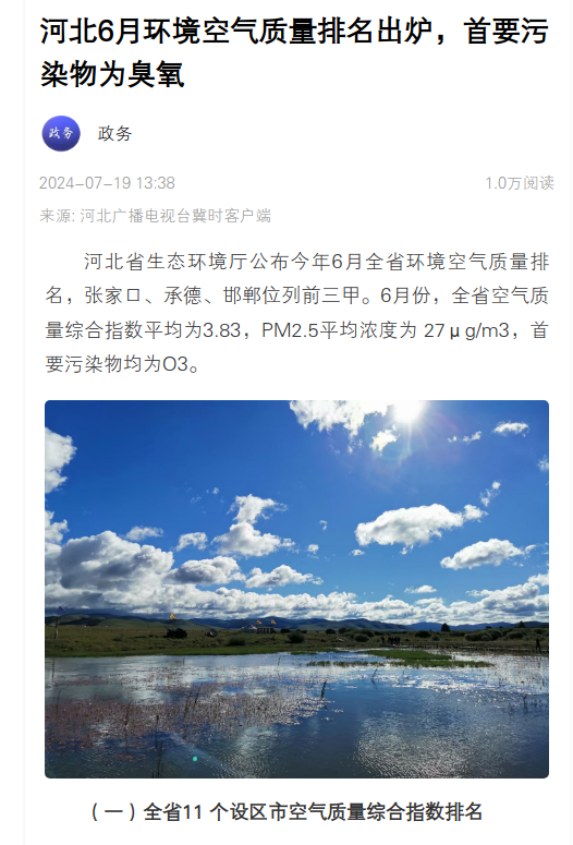 河北广播电视台冀时客户端:河北6月环境空气质量排名出炉,首要污染物为臭氧