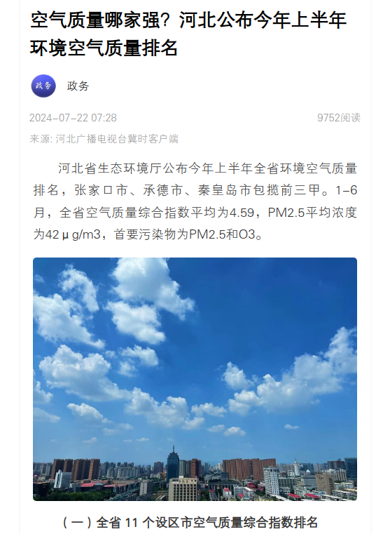 河北广播电视台冀时客户端:空气质量哪家强?河北公布今年上半年环境空气质量排名