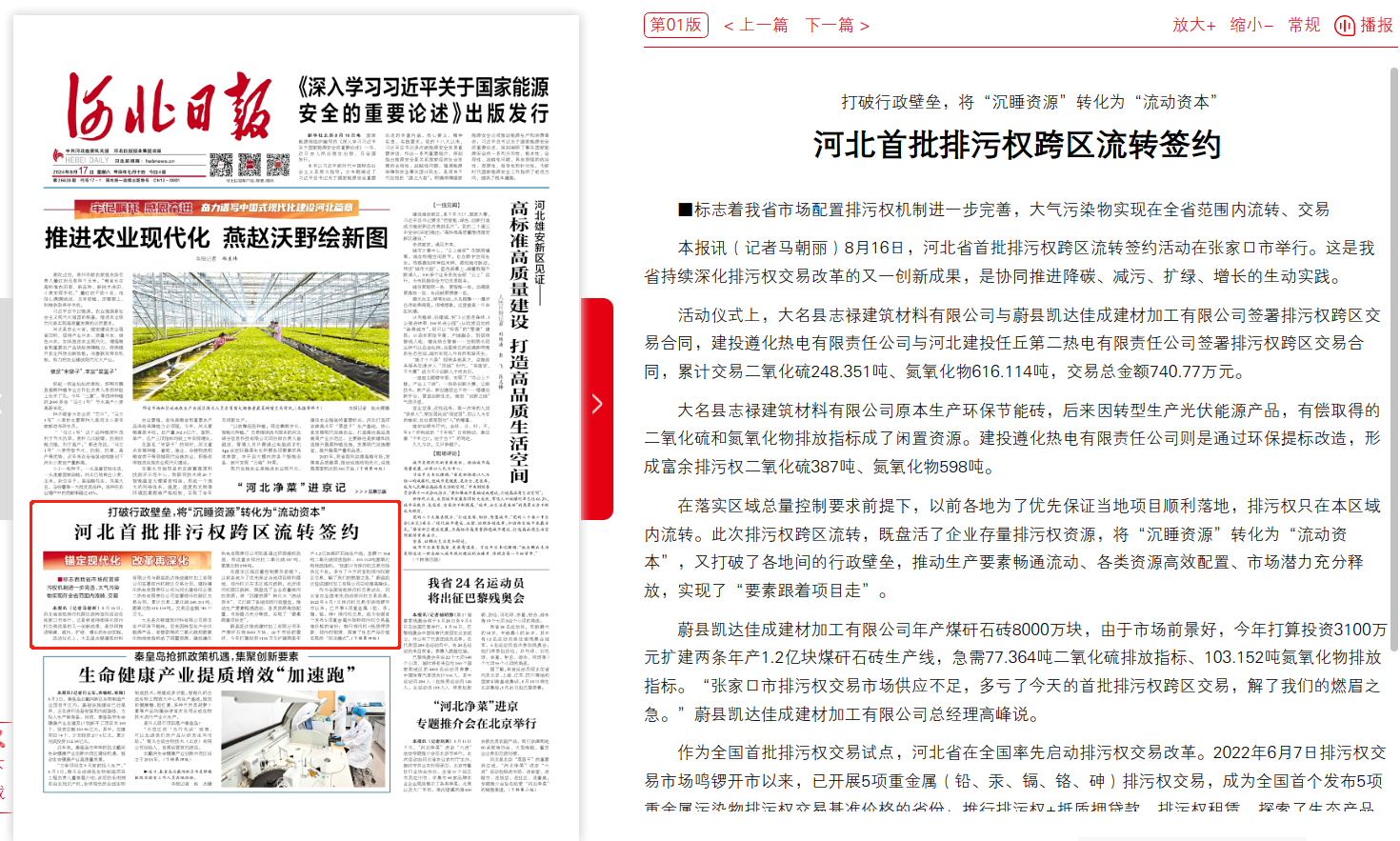 本报讯(记者马朝丽)8月16日,河北省首批排污权跨区流转签约活动在张家口市举行。这是我省持续深化排污权交易改革的又一创新成果,是协同推进降碳、减污、扩绿、增长的生动实践。