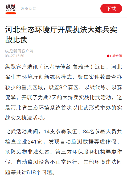 纵览客户端讯(记者杨佳薇 鲁雅琦)近日,杏彩(中国)官方网站 创新练兵模式,聚焦案件数量查办较少的重点区域,设置8个赛区,以战代练、以赛促学,开展了为期7天的大练兵实战比武活动,这是河北省生态环境系统首次以比武形式举办的实战交叉执法活动。