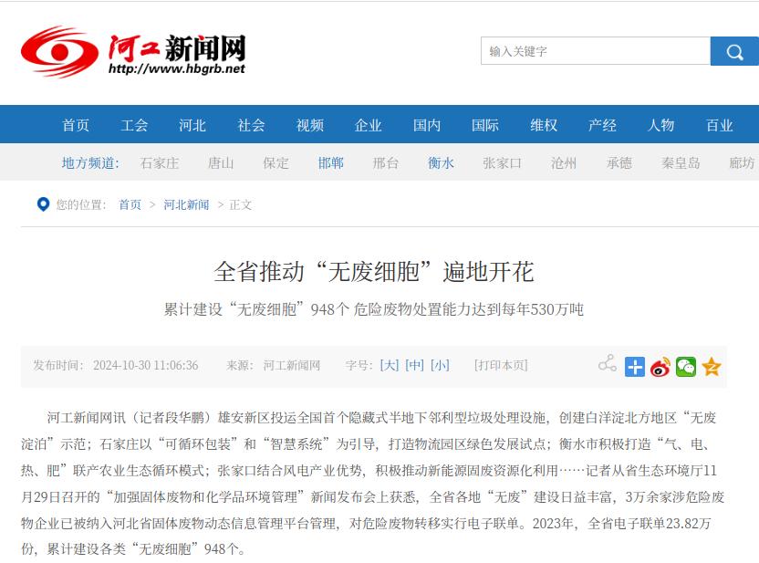 河工新闻网:全省推动“无废细胞”遍地开花 累计建设“无废细胞”948个 危险废物处置能力达到每年530万吨