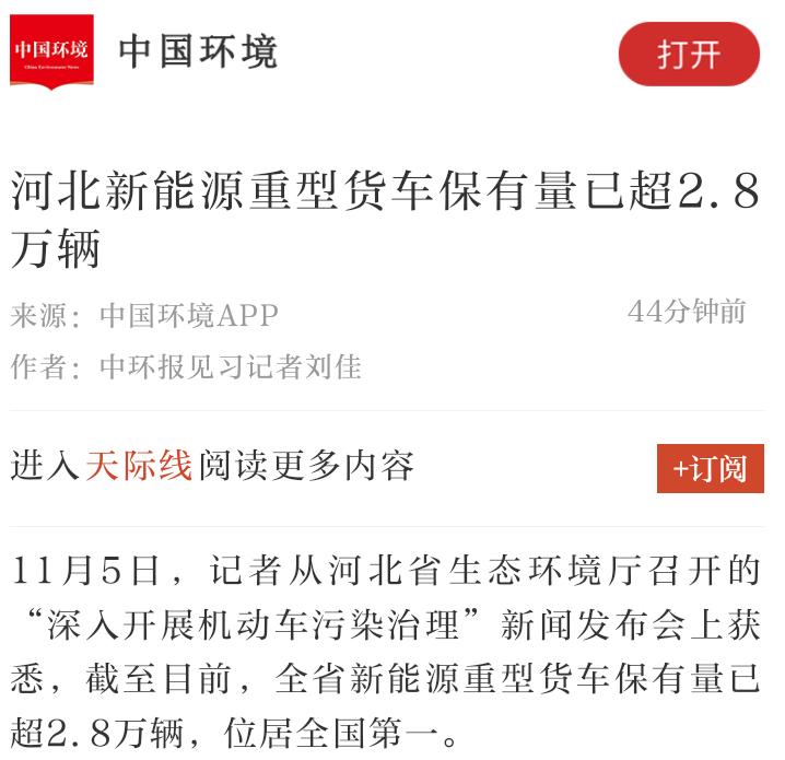 中国环境客户端:河北新能源重型货车保有量已超2.8万辆