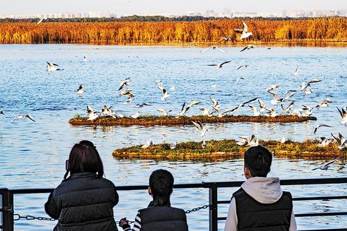 11月17日,游客在衡水湖岸观赏红嘴鸥。