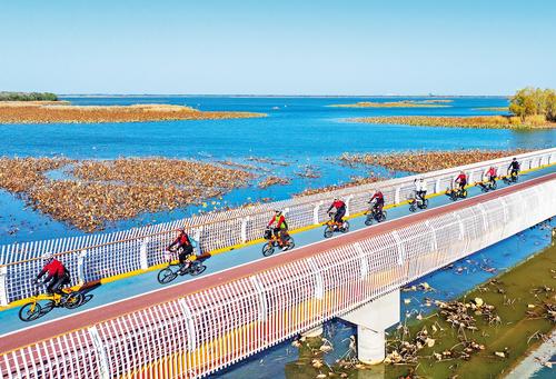 11月17日,骑行爱好者在衡水湖环湖绿道上尽享运动乐趣。