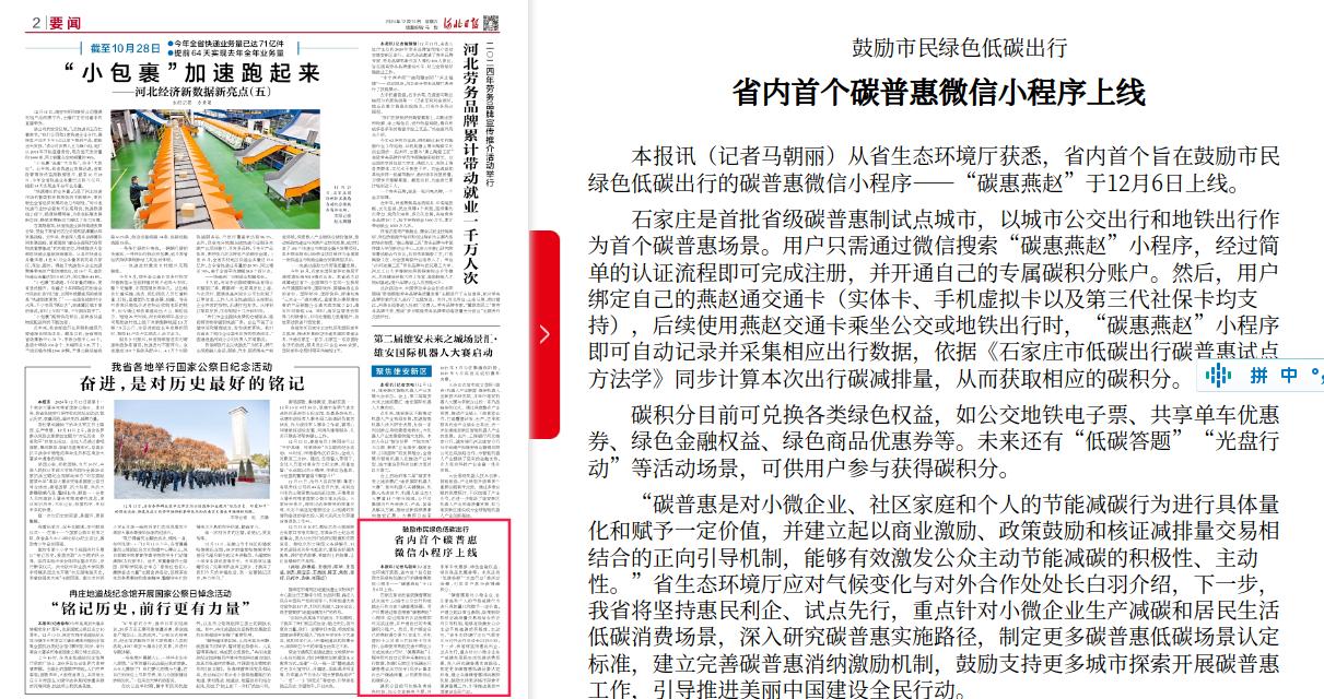 河北日报:鼓励市民绿色低碳出行 省内首个碳普惠微信小程序上线