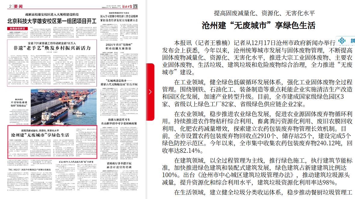 河北日报:提高固废减量化、资源化、无害化水平 沧州建“无废城市”享绿色生活