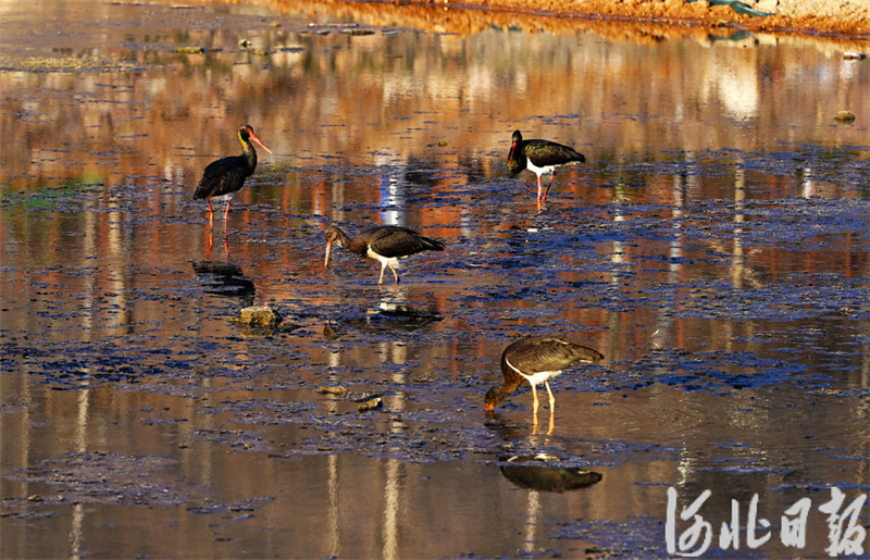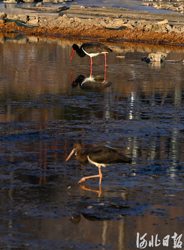 12月18日清晨,黑鹳在武安市洺河湿地觅食休憩。