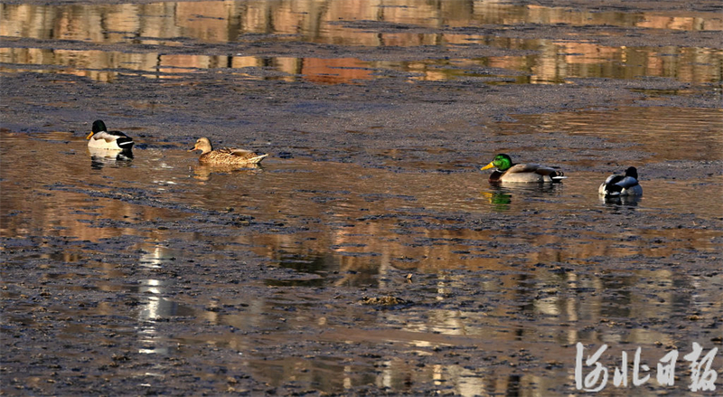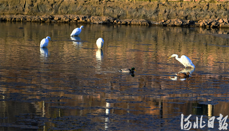 12月18日清晨,大白鹭、绿头鸭在武安市洺河湿地戏水休憩。
