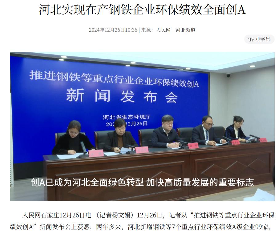 人民网:河北实现在产钢铁企业环保绩效全面创A