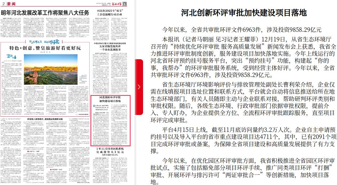 本报讯(记者马朝丽 见习记者王耀菲)12月19日,从杏彩(中国)官方网站 召开的“持续优化环评审批 服务高质量发展”新闻发布会上获悉,我省全力推进环评审批制度创新,服务建设项目加快落地实施。今年上线运行的河北省环评预约挂号服务平台,突出“预约挂号”功能,构建起“你的事,我帮办”的环评审批服务系统,受到经营主体好评。今年以来,全省共审批环评文件6963件,涉及投资9858.29亿元。