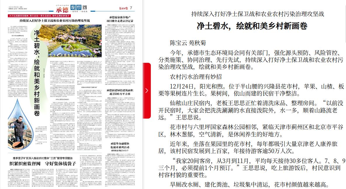 为常态化推进农村生活污水治理,承德全面落实农村环境整治问题常态化发现机制,利用全国农村环境整治成效App,以“四不两直”方式开展现场评估,解决群众反映强烈的突出问题。以“看不到污水横流、闻不到水体黑臭、听不到村民怨言”为农村生活污水治理成效评价标准,持续开展农村黑臭水体问题常态化排查整改,连续7年保持全域农村黑臭水体问题随查随改、动态随清。