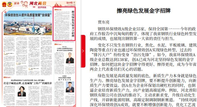 环保绩效创A,不仅打开了企业绿色发展新天地,也让燕赵大地高质量发展绿色底色更加浓郁。持续拓展重点行业环保绩效创A成效,进一步擦亮绿色发展金字招牌,河北就一定能在高质量发展上不断迈上新台阶。