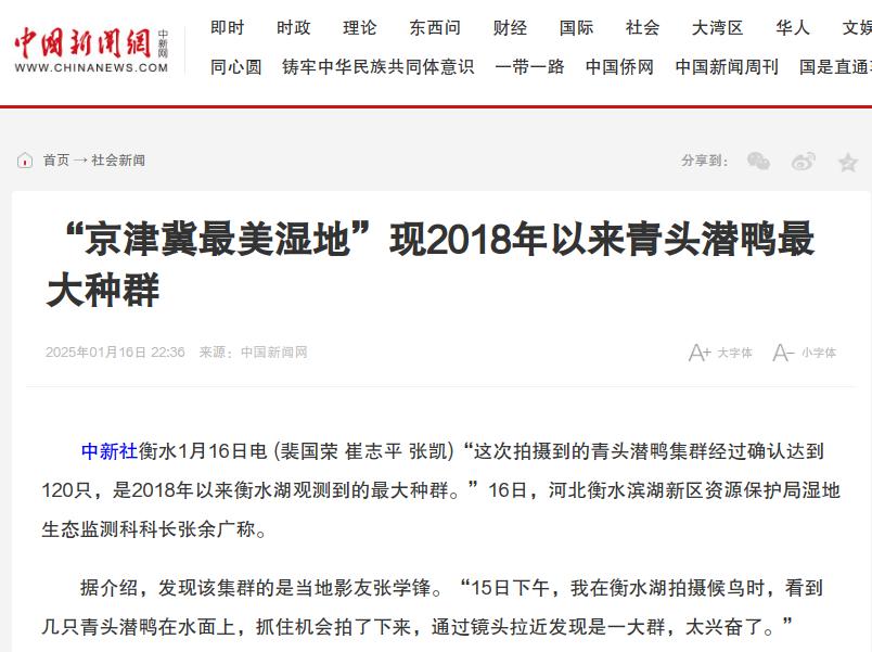 中国新闻网:“京津冀最美湿地”现2018年以来青头潜鸭最大种群