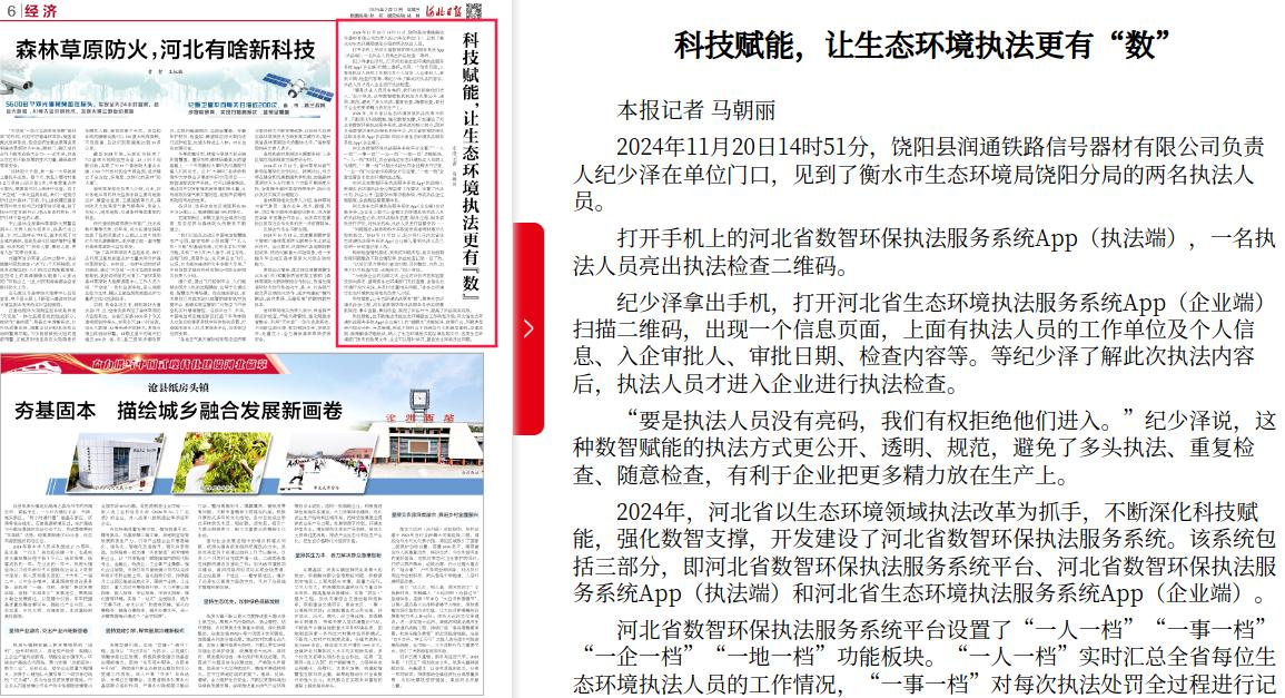 科技赋能,让生态环境执法更有“数”。聚焦生态环境执法全过程,河北省数智环保执法服务系统实现事前规范、事中监督、事后核查,规范了执法行为,提高了执法服务成效。