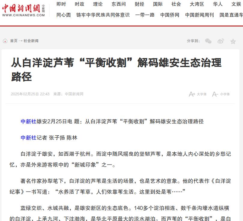 中新网:从白洋淀芦苇“平衡收割”解码雄安生态治理路径