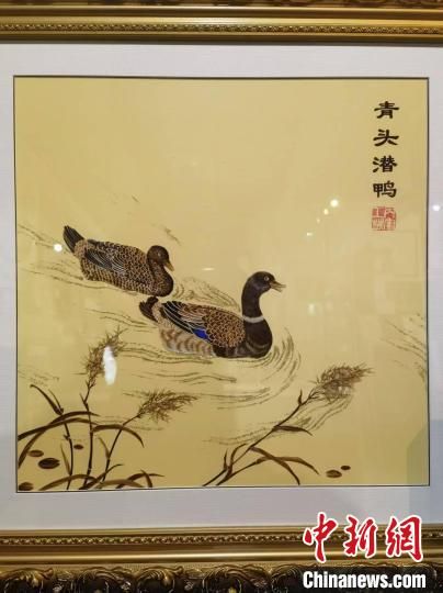 图为杨丙军创作的青头潜鸭芦苇画。(受访者供图)