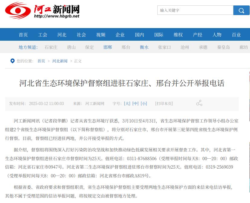 河工新闻网:河北省生态环境保护督察组进驻石家庄、邢台并公开举报电话