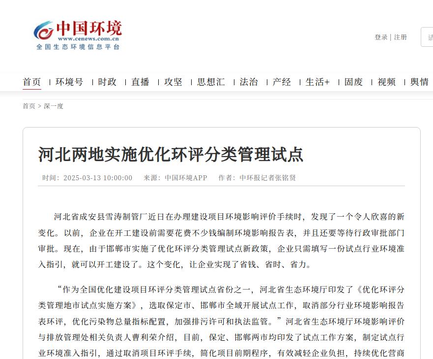 中国环境客户端:河北两地实施优化环评分类管理试点