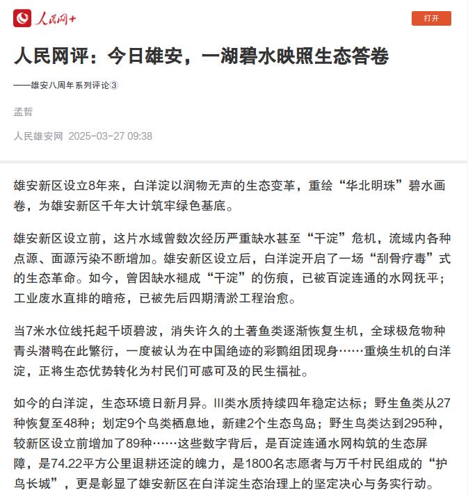 人民网:今日雄安,一湖碧水映照生态答卷 ——雄安八周年系列评论③