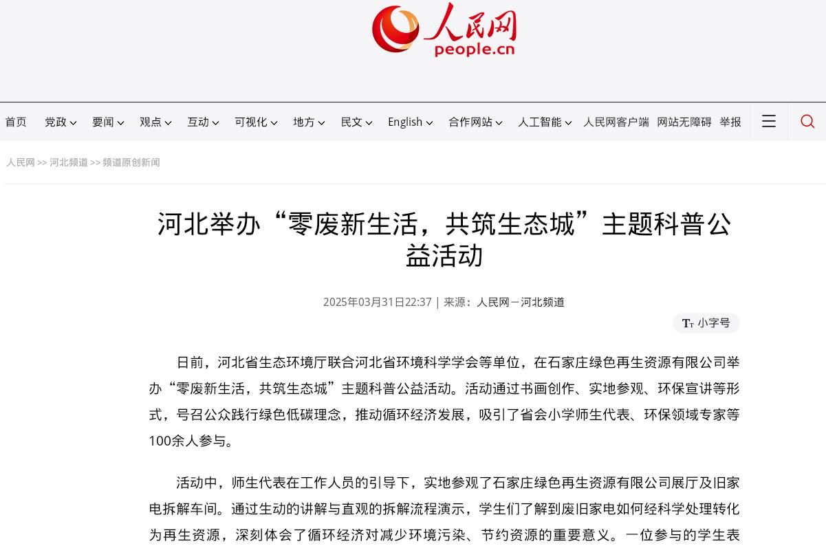 人民网:河北举办“零废新生活,共筑生态城”主题科普公益活动