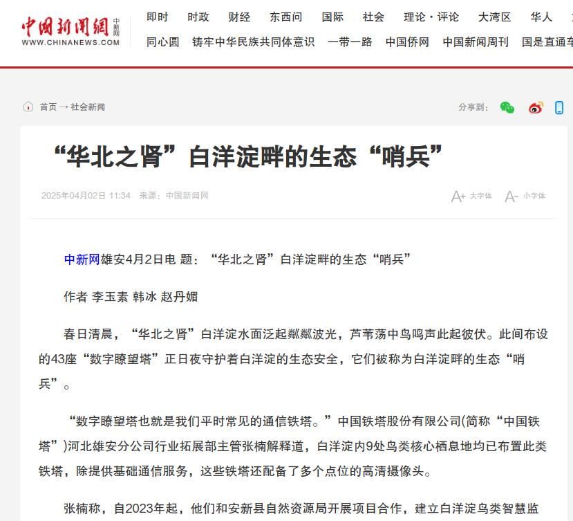 “数字瞭望塔也就是我们平时常见的通信铁塔。”中国铁塔股份有限公司(简称“中国铁塔”)河北雄安分公司行业拓展部主管张楠解释道,白洋淀内9处鸟类核心栖息地均已布置此类铁塔,除提供基础通信服务,这些铁塔还配备了多个点位的高清摄像头。