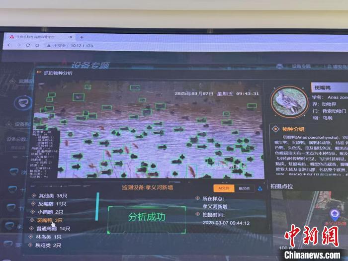 官方数据显示,截至2025年3月,白洋淀野生鸟类增加至295种,较雄安新区设立前增加了89种。现场通过监测系统画面可以看到,在抓拍到鸟类后,系统会自动进行鸟类物种识别、目标标注、鸟类数量统计分析。