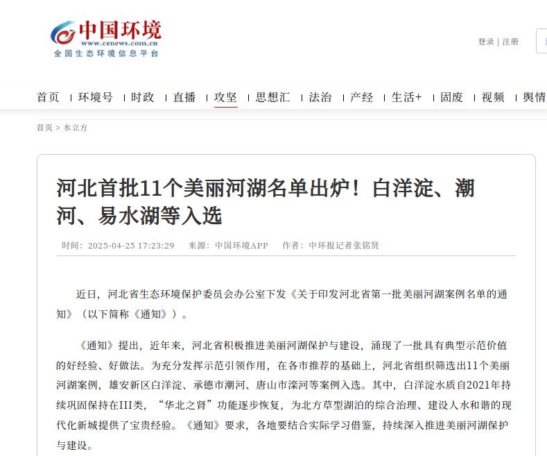 中国环境客户端:河北首批11个美丽河湖名单出炉!白洋淀、潮河、易水湖等入选