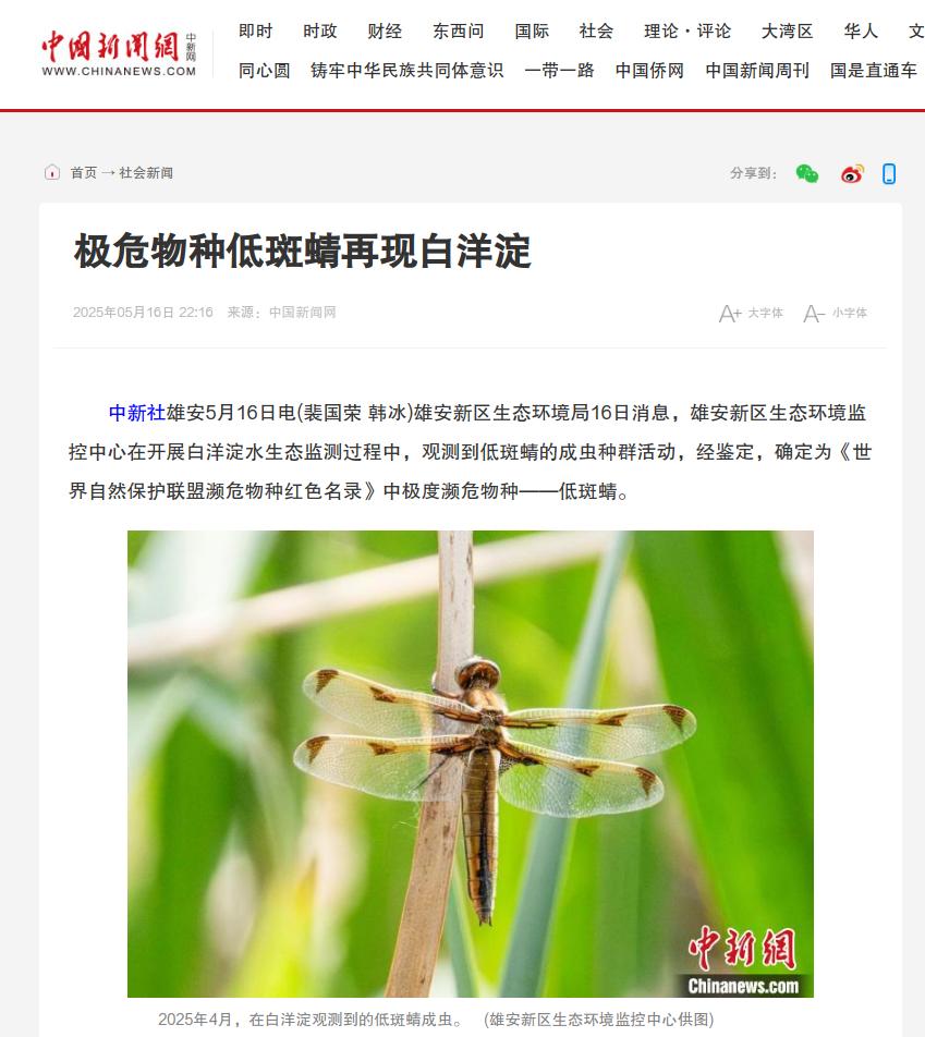 中新网:极危物种低斑蜻再现白洋淀