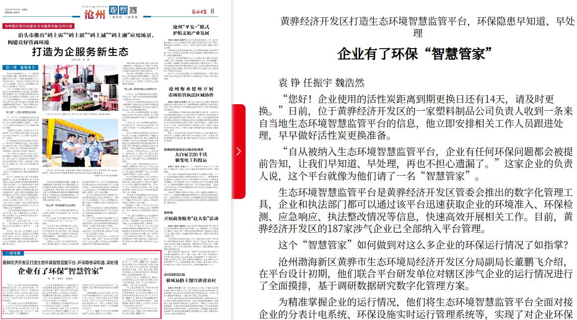 河北日报:黄骅经济开发区打造生态环境智慧监管平台,环保隐患早知道、早处理 企业有了环保“智慧管家”