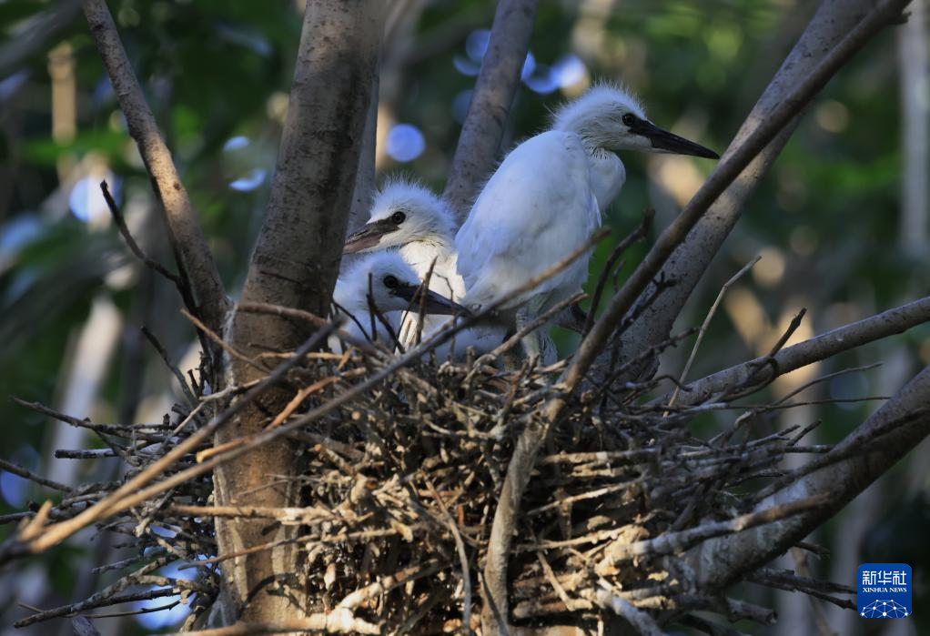 5月24日,三只白鹭雏鸟在唐山市丰南区沿海林地的巢穴中休息。