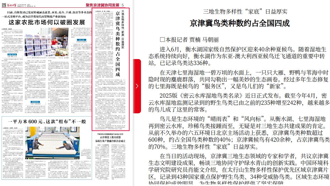 河北日报:三地生物多样性“家底”日益厚实 京津冀鸟类种数约占全国四成