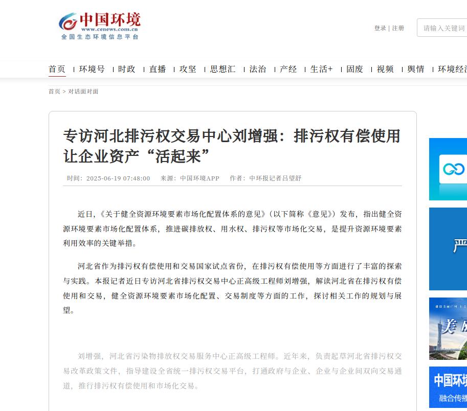 中国环境客户端:专访河北排污权交易中心刘增强:排污权有偿使用让企业资产“活起来”