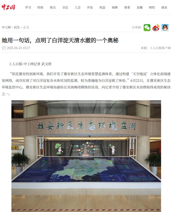 “依托雄安的创新环境,我们开发了雄安新区生态环境智慧监测体系,通过构建‘天空地淀’立体化前端感知网络,成功实现了对白洋淀复杂水体状况的监测,较为准确地为白洋淀做了体检。”621日,在雄安新区生态环境监控中心,雄安新区生态环境局副局长吴海梅用精炼的话语,向记者介绍了雄安新区水治理取得成效的秘诀之一。